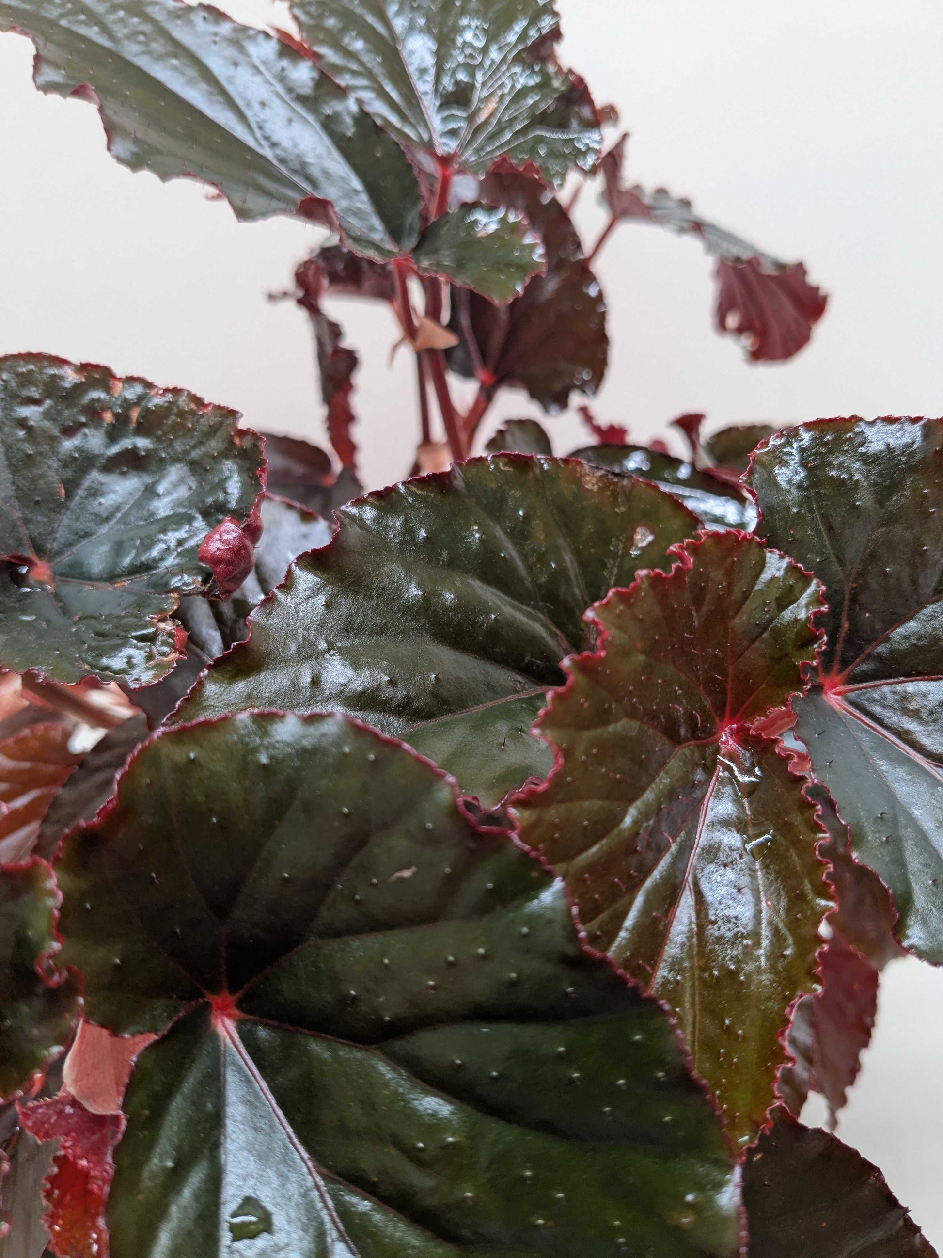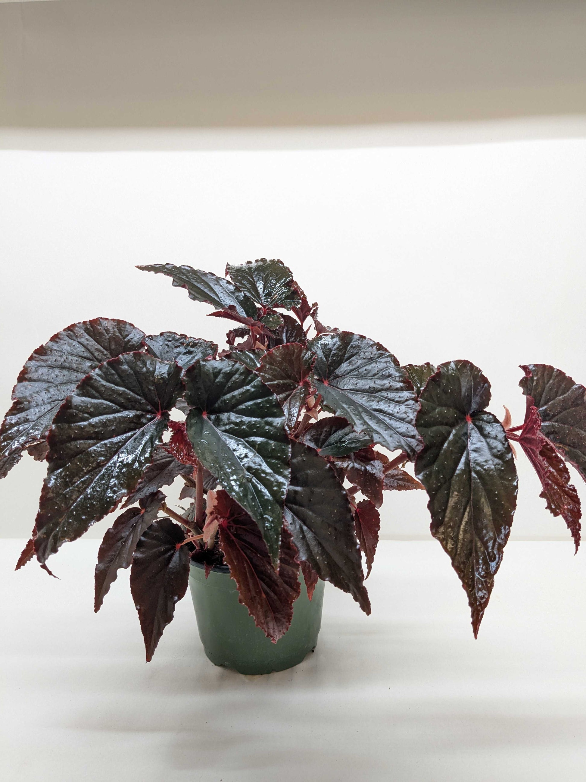 Embrace the darker side of beauty with the enchanting Begonia 'Black Magic'. This rex begonia is a true masterpiece, captivating with its deep, velvety black angel-wing leaves, speckled with subtle raised dots and flashing a stunning secret crimson on their undersides. A dramatic and sophisticated choice, 'Black Magic' is the ultimate statement plant for any indoor foliage collection.