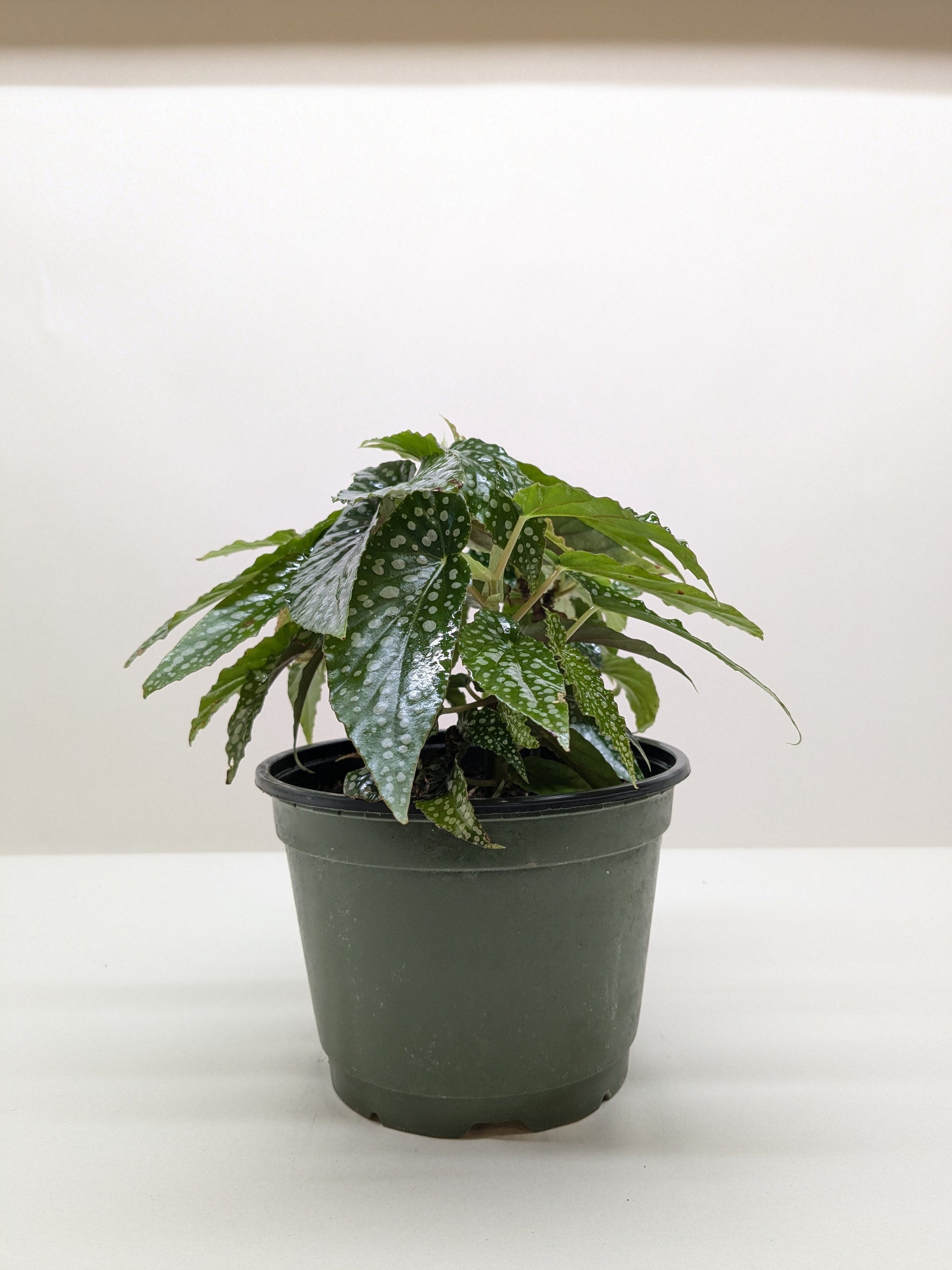 Introduce a touch of modern whimsy to your plant collection with the stunning Begonia 'White Ice'. This vigorous and easy-to-grow Angel Wing begonia features dramatic, deep green leaves splashed with a pattern of crisp, silvery-white polka dots. With its eye-catching foliage and graceful, upright canes, 'White Ice' is a true showstopper that brings playful sophistication to any bright space.